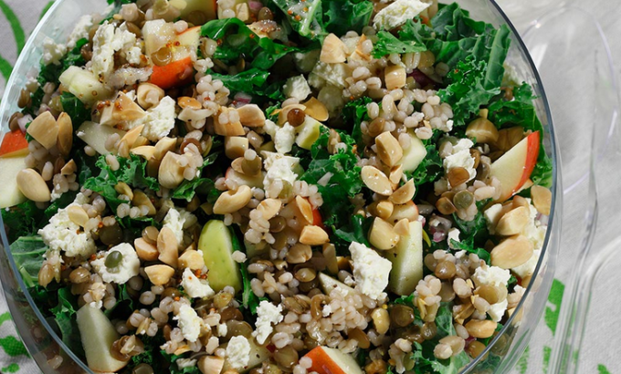 Barley & Lentil Salad with Kale, Apples, Almonds, & Feta
